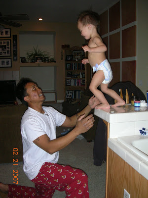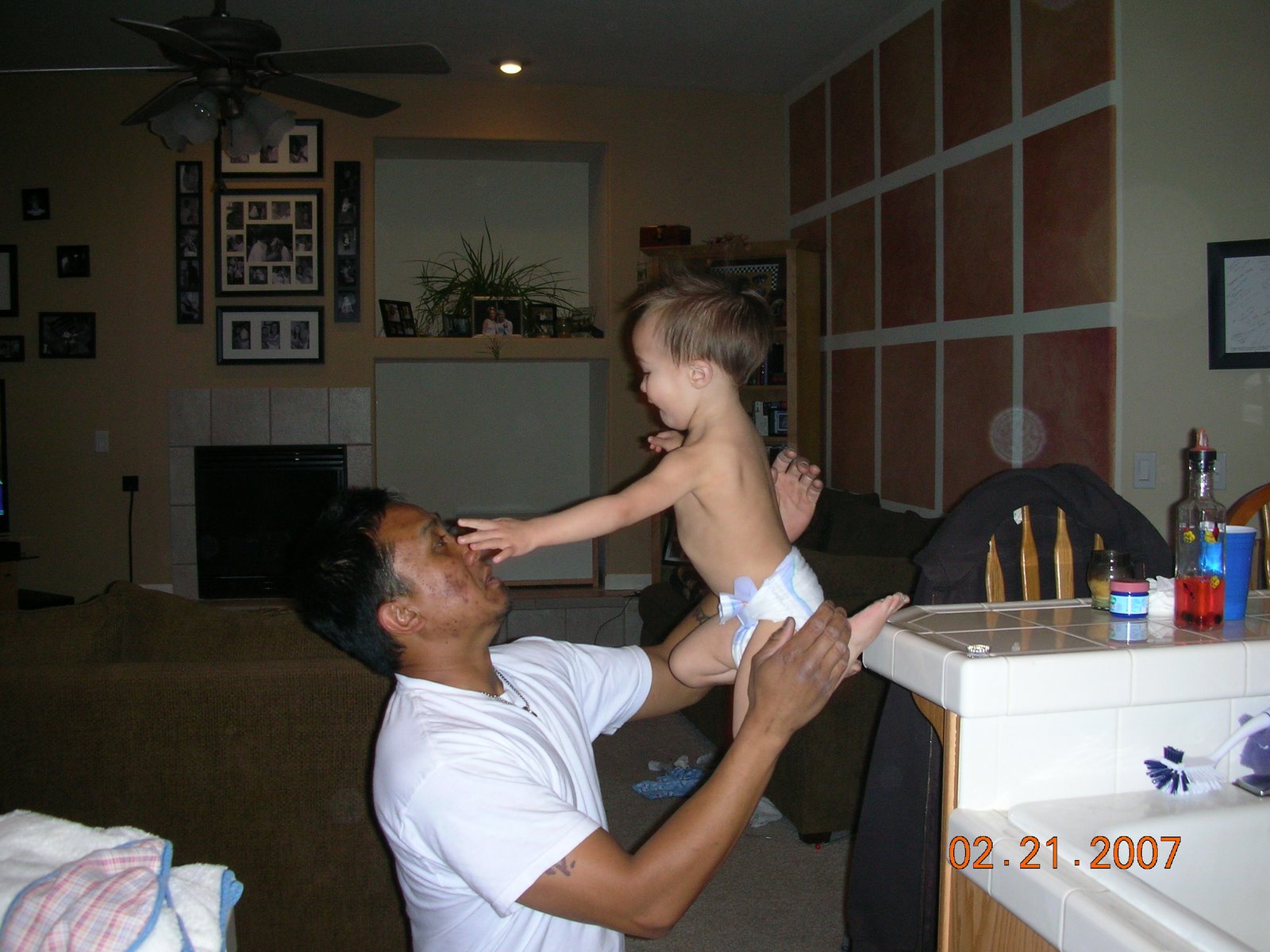 I was giving Brandon a bath today and all the sudden he got this funny look on his face like he was about to take a dump in the tub. Up to now we have been very lucky not to encounter any floating logs or COWS as Jenny McCarthy’s son put it. Luckily there was no poopoo but it reminded me of Brandon’s first or second bath. We had just finished and pulled him out. We wrapped him up in his little towel that used to wrap around him 43 times and now, barely wraps around once and leaves his little feet dangling out. Anyway I got him all swaddled in his little hoodie towel when SPLOOOSH SPWIKWAT BOOOOOM. I look down and his little cream colored towel was MUSTARD YELLOW! Rob and I just looked at each other. We didn’t know what to do. We were novices at this parenting thing. What do we do? Do we re-bathe him, or baby wipe him or…stand there and look like dumb asses? We chose to stand there looking like idiots and then we wiped him down with the towel and then baby wiped him. The whole situation was pretty funny. It was like he purposely held it all in just to mess with us. It was as if he was letting us know from that point on that he was running the show. Ahhh my little boy.
