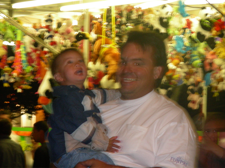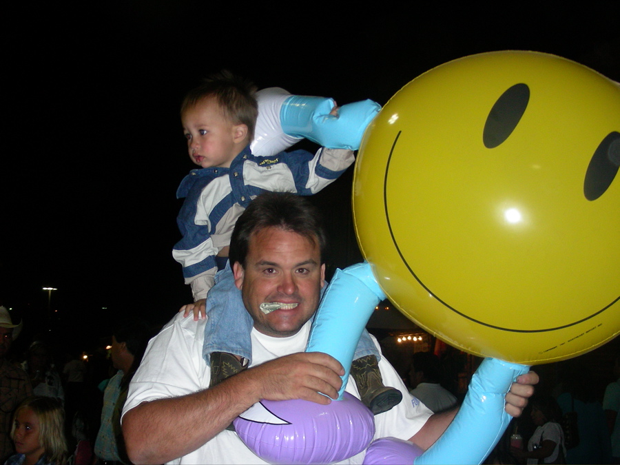 This fucking balloon now lives in my house. It is taller then Brandon and wider then most of my doors. He drags it alllll over the place. Notice his boots and shirt in this picture. I guess he made my dad carry him all around the fair on his shoulders, while holding the damn smiley balloon guy. The next morning he got up rushed to the balloon and brought it to me screaming bawoon bawoon bawoon like I had never seen a balloon before. Did I mention they were at the rodeo until midnight? I guess they showed Brandon that giant four story slide and he wouldn’t stop going down it. So finally at 11:45 PM when I called to see if my child was still alive they were carrying him out kicking and screaming. He then road home with that balloons legs wrapped around him in the carseat because he refused to put it down! What a wonderful night for Brandon.