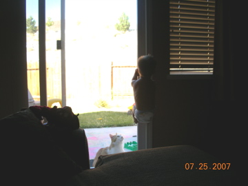 Look very closely there is a small monkey child who is super pissed off that mom won’t let the cat inside!