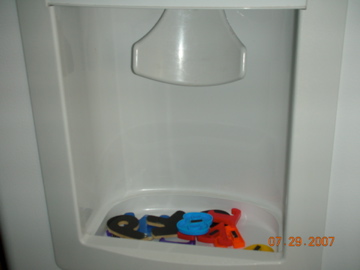 Then he got bored and stuck all his magnet letters in the water trap on my refrigerator, put the light cover from inside my fridge into a cabinet and finger painted with a tub of cream cheese (can’t believe I didn’t get pictures of that)