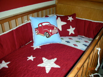 Today my wonderful amazing and terrific friends, Katie, Ginger and Alli came over and painted Codi’s room for me. So far all I have set up is the crib since technically I can’t start moving stuff until the end of September so my husband can keep his Playstation room as long as possible. I also bought some matching sheets and pillow cases for the bed, the quilt I already had. I am keeping the bed in there so I can sleep close to Codi, and I think it will make it so much easier for me to put him in his own crib rather my bedroom for 16 months! So here is the room so far, I’ll show you the rest when I get there!