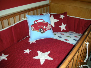 Today my wonderful amazing and terrific friends, Katie, Ginger and Alli came over and painted Codi’s room for me. So far all I have set up is the crib since technically I can’t start moving stuff until the end of September so my husband can keep his Playstation room as long as possible. I also bought some matching sheets and pillow cases for the bed, the quilt I already had. I am keeping the bed in there so I can sleep close to Codi, and I think it will make it so much easier for me to put him in his own crib rather my bedroom for 16 months! So here is the room so far, I’ll show you the rest when I get there!