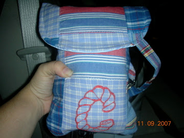 Chrissy has obviously been following my diaper bag debacle. She sent me this amazing little diaper caddy thingy that matches my diaper bag so well. I love this and I want to carry it around everywhere I go and show off how cool I am that I have a hand made diaper thingy. The best part is that I was able to take the skip hop doohicky and store extra diapers and wipes and gadgets in it for my car. It was just the right size to put some spares in and hide them under my seat.