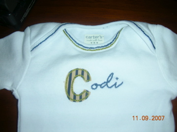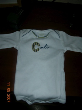 Lorie took pity on me one day when I told her me and my friends are soooo not creative and so she decided to make a present for my little Codi. It is so damn cute and so personal I want to frame it. But I figure I’ll wait to frame it until Codi wears it a few times and then craps on the bottom and I need to frame it to hide the stains!