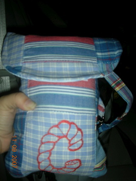 Chrissy has obviously been following my diaper bag debacle. She sent me this amazing little diaper caddy thingy that matches my diaper bag so well. I love this and I want to carry it around everywhere I go and show off how cool I am that I have a hand made diaper thingy. The best part is that I was able to take the skip hop doohicky and store extra diapers and wipes and gadgets in it for my car. It was just the right size to put some spares in and hide them under my seat.