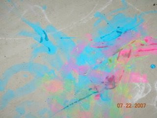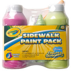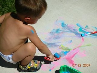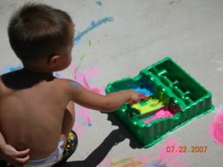 Crayola sidewalk paint that I used a few pictures back. I love this product. The product I actually got was package set from Toys R Us for about $9.99. My package came with three colors, Pink, Blue and Yellow. It came with two pieces of chalk also. It was enclosed inside of a neat paint tray with three spots for the base colors and then four spots on top to mix up your own colors. It also came with a brush and a roller. The directions tell you to shake the paint well before pouring. I didn’t do that and the paint came out a little lumpy the first time. However after I read the directions and poured it out, it came out a nice consistancy. The colors were very bright and pretty. As the box says the colors get brighter as the paint dries which turned out to be exactly what happened. The roller worked great and allowed me to draw shapes and fill in large spaces at once. The brush also worked wonderful and made it easy to mix up colors. Both the brush and roller seem to be great quality. The brush has now been outside for a full two weeks and they still remain intact. In fact the brush has even spent a few nights in the pool and it still works great. I was worried that if it wasn’t rinsed it would cake up and not be usable again. However since the paint is a water based paint, one dunk in the pool and the brush was working perfect. Also the bristles are all still in tact and none seem bent or misshapen. The roller is still working great and rinses out very easily. The box states that to rinse it off your side walk simply hose with water and some mild scrubbing my be necessary. As far as I saw simply spraying it with a spray head hose worked great. The parts that I didn’t clean off are still there however they have greatly faded by the sun which leads me to believe they will also easily wash off even after being there for a while. As you can see Brandon and I were covered in paint. All I had to do was get myself wet and the paint practically fell off. I also got some one my bathing suite and it also washed right off and left no trace that it was ever there. Another great feature is that since this is a water based paint, if you find it drying at all in the bottle you can simply add a little water, shake and whala you have new paint. You can buy more paint for $5.99 for a set of all three colors and two more pieces of chalk. Over all I also rate this product a 5 out of 5 because it worked amazing, provided over two hours of fun (that is a long time to hold a two year olds attention) and was good quality!