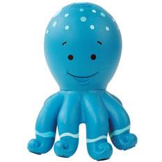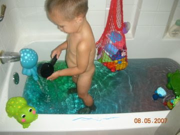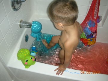 Ozzie the Octopus Faucet Cover. At first I thought it was just a faucet cover like I already had. After further inspection I discovered it came with three little color tablets. The tablets look similar to the tablets that come with Easter Egg dying kits, however they were a bit bigger. The instructions told me to put Ozzie over the faucet and turn on the water. Then you take the tablets and slip them inside of Ozzies mouth. This was very simple and in fact with some practice I bet even Brandon could do this (however I think he would use the whole jar up at once). The first one I put in appeared to be pink. Then I added a yellow and we made orange. After that I put in blue and I made half red that then morphed from purple to blue causing a really neat tie dye effect. After that I noticed the back of the box gave you a color key showing you that if you put two tablets in you could make different colors. I put in a blue and yellow and made green! Brandon thought this was a blast and had a great time with the colors. He liked that if he put his hand in the water his hand appeared to change colors. Also he liked filling his toys up with all the colors. After all the colors mixed in the bath I was pleased to see that it didn’t turn brown or black but a fun shade of purple. The box said this could stain clothing but I used a yellow towel to wipe up and saw no stains at all. The bath drained completely white and clear with no color left behind. Brandon was also color free which I was very happy to discover. I got some of the dye on myself and just wiped it on a rag and it came right off. You couldn’t tell that we had been playing in purple water at all. After the bath I wrapped him in a yellow towel and saw no residual color on the towel after wiping him from head to toe to see. I rate this product four and a half out of four stars. The only reason it doesn’t get five is because it only came with three tablets and we used those right away. Luckily they sold a separate container of tablets and my friend was nice enough to include them. Here are a couple pics of Brandon enjoying his new toy!